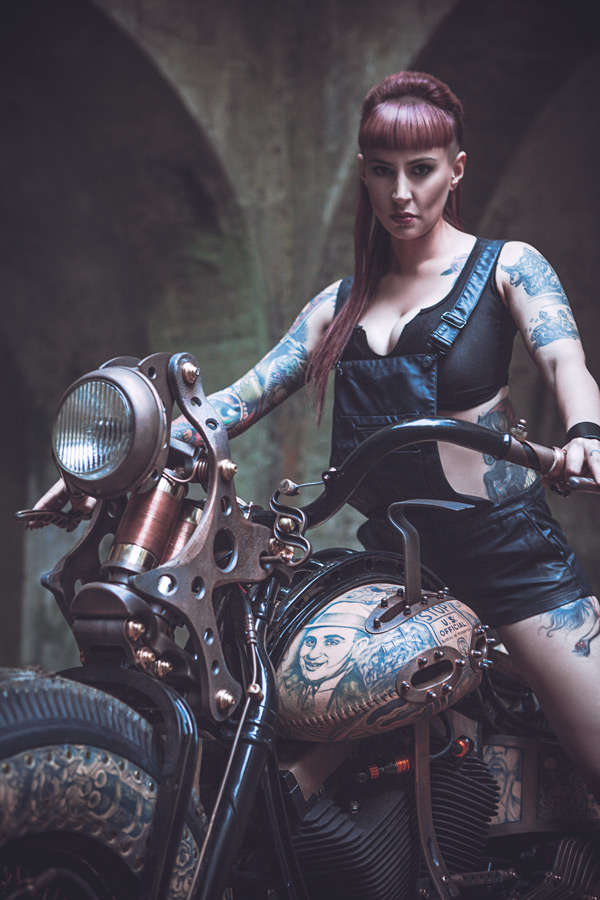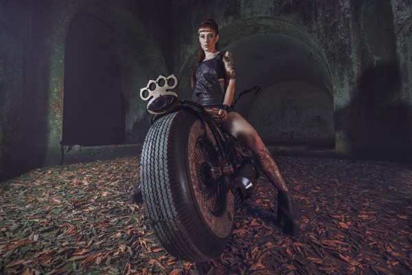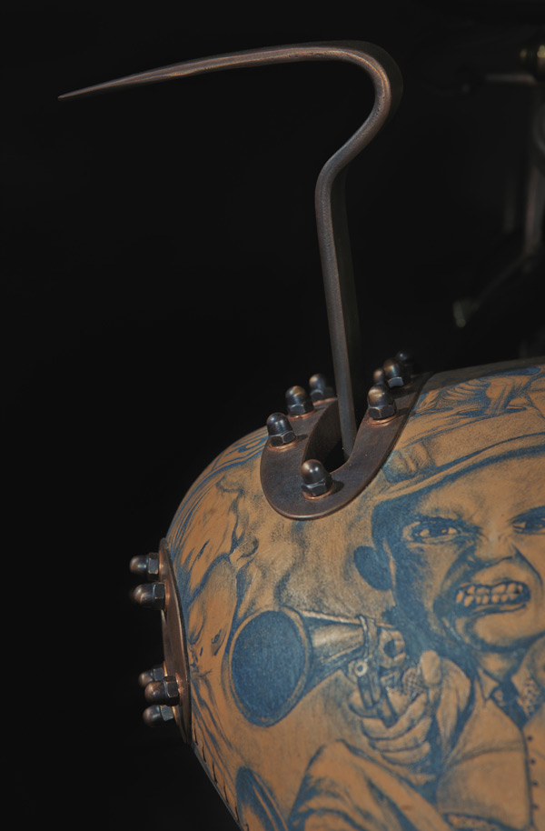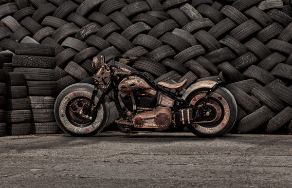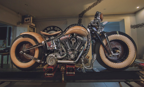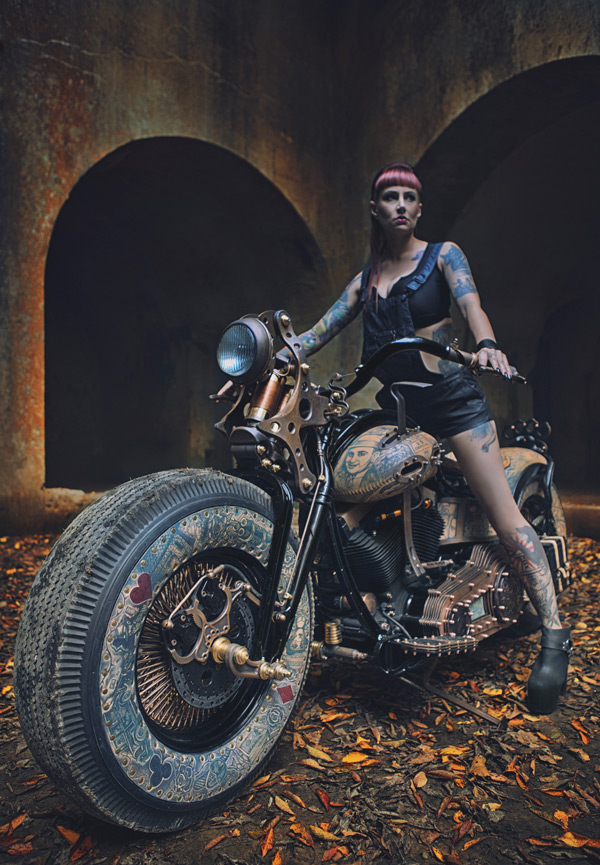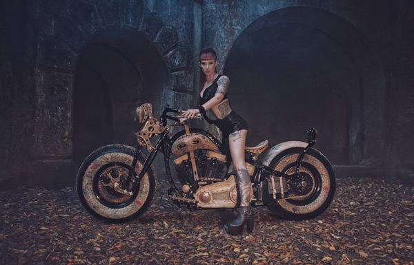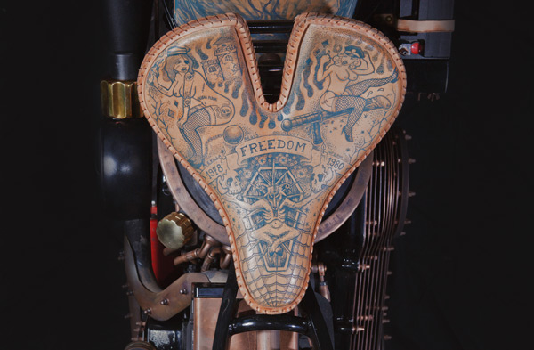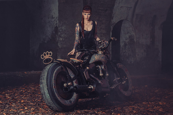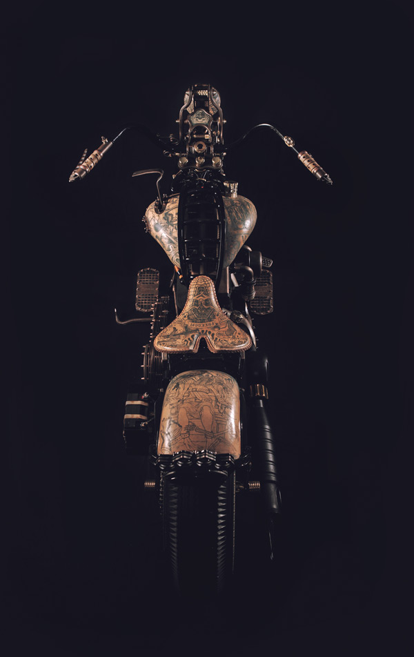 The Recidivist is a motorcycle created in devotion to the traditions of the modern motorcycle industry and the human culture of the artistic world of tattoos. Motorbikes are commonly adorned with tattoo motifs using an airbrush, however the uniqueness of The Recidivist lies in the fact that the bike’s entire construction is covered in tattooed skin branded directly onto the bike’s tires, tanks, seat, rear fender, lamp and many other smaller elements. Light colored cow hide leather – similar to the color of human skin – is engineered onto the bike. All of that makes The Recidivist world’s first tattooed motorcycle. The bike had its premiere in September 2014 at the London International Tattoo Convention – the most prestigious body adornment convention in the world.