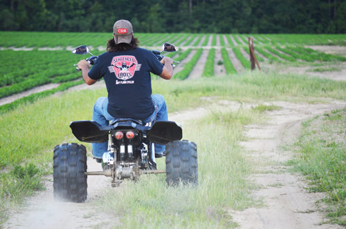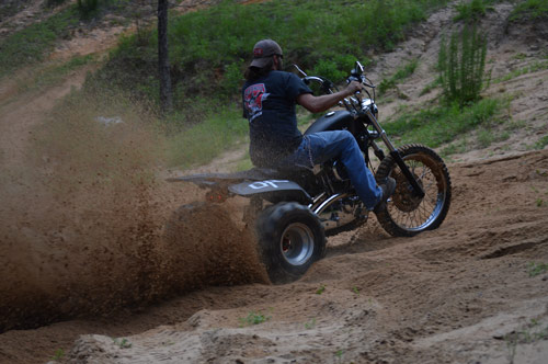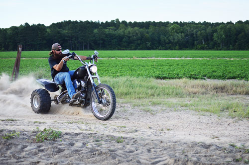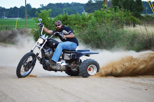 Dirt Floor Cycles lost a true friend and member of the crew in February of 2015. Marcus Hodges, David’s nephew was taken too early by a car accident. Afterwards the shop acquired his 95 Sporty from the family and ideas to honor him through the bike started flowing. Choppers, bobbers, they’ve been done. David had a dream one night about an off road trike, and thought it to be the perfect tribute (Marcus was really big into four-wheelers, three-wheelers, and dirt bikes). They started figuring on how to make it work after several discussions about if it was the right thing to do. A custom swing arm was built to accommodate the live axle, converted to chain drive, custom seat mount, rear fender, and tail lights. Off road tires were a must for the look they were going for, as well as making the v-twin hook up in dirt. It all came together in 13 days start to finish, and turned out to be an awesome performance machine. They are very proud of this special project and are sure Marcus is smiling down as it’s being twisted to the lock.