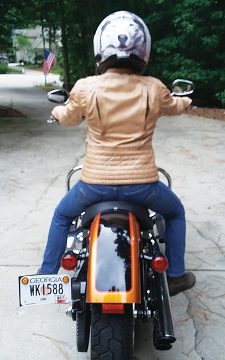 By the time the ink was dry on the divorce papers Sandy had signed up for a motorcycle safety class! After getting the ‘M’ on her driver’s license, she purchased a Whisky-colored Harley-Davidson Softail Slim.