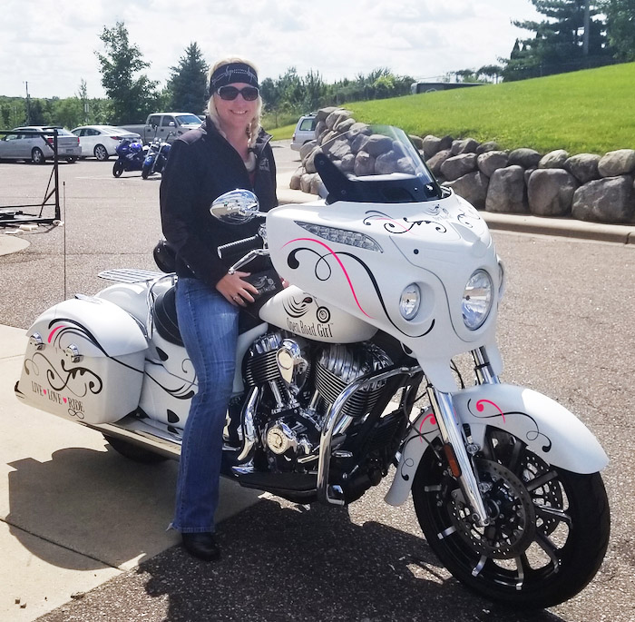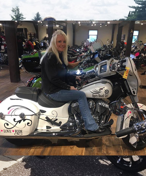 In April 2015, after working her full-time job and building her business, Melinda took the big step and quit her job! Now she works all the time in the business she loves. Now she even rides an Open Road Girl branded Indian Chiefton bike!