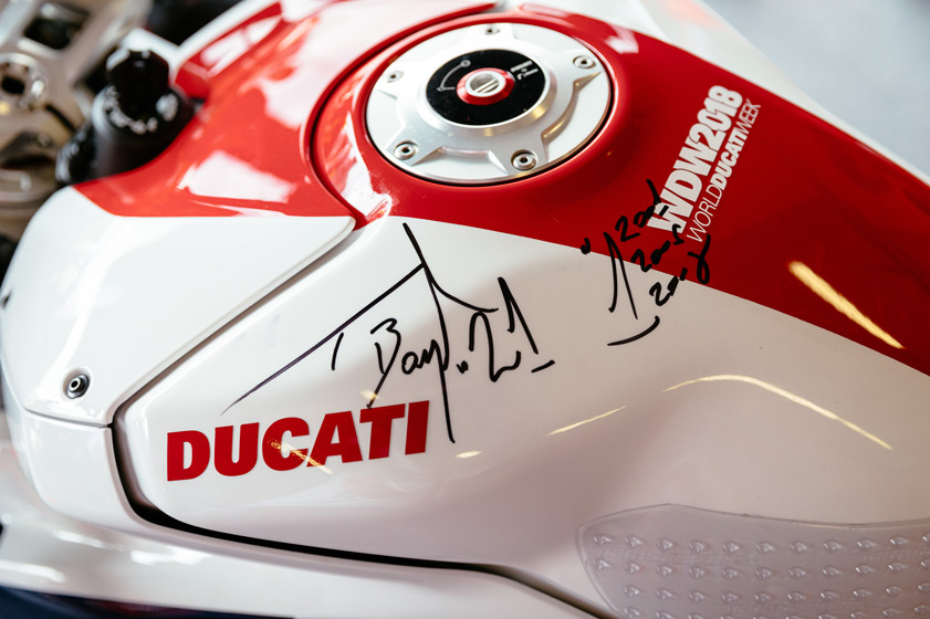 The bikes feature exclusive livery and graphics dedicated to their individual riders, with color schemes drawing their inspiration from the bikes used in MotoGP or SBK races. On each steering yoke, a badge shows the rider’s name and race number. Each rider’s permanent autograph on the tank, plus a certificate of authenticity signed by Claudio Domenicali, CEO of Ducati Motor Holding, as well as the rider himself, make every motorcycle even more valuable. To top things off, each bike comes with a series of special components used during the Race of Champions and a complete set of original parts, exhausts included, required for legal road use.