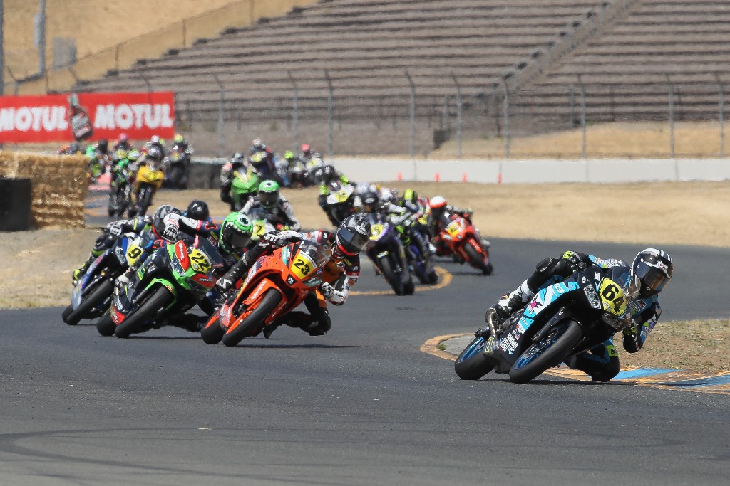 Paul Carruthers of MotoAmerica notes, “Sonoma Raceway is a technical track, with lots of turns, changes in elevation, and tight corners. It’s a rider’s road course that challenges even the best racers, including racers who are local to the area.” That was definitely true for the young guns of Junior Cup, as lead changes, crashes, and fierce bar-to-bar competition defined their races both days. Ashton Yates took the checkered in race 1 when Alex Dumas and Cory Ventura both crashed out, then race 2 saw the podium rearranged, with Ventura, Dumas, and Yates taking the flag, in that order.