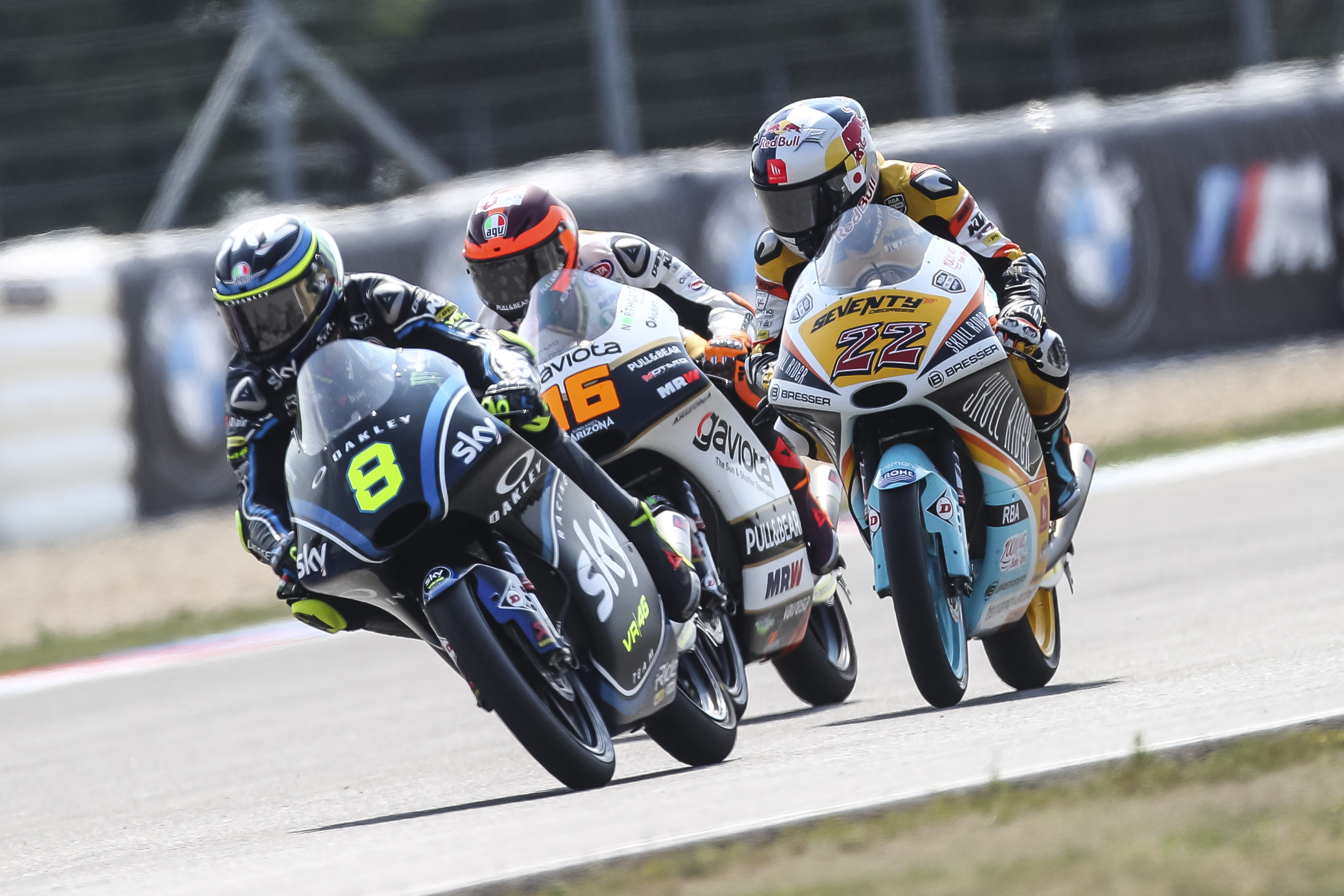 The young rookie of the Sky Racing Team VR46 impresses in the leading group, 19th Nicolò Bulega.